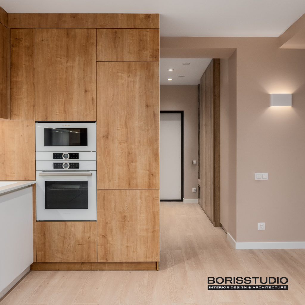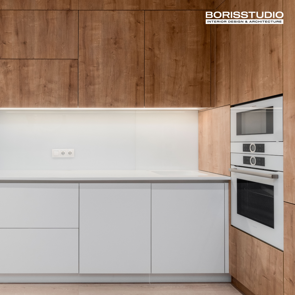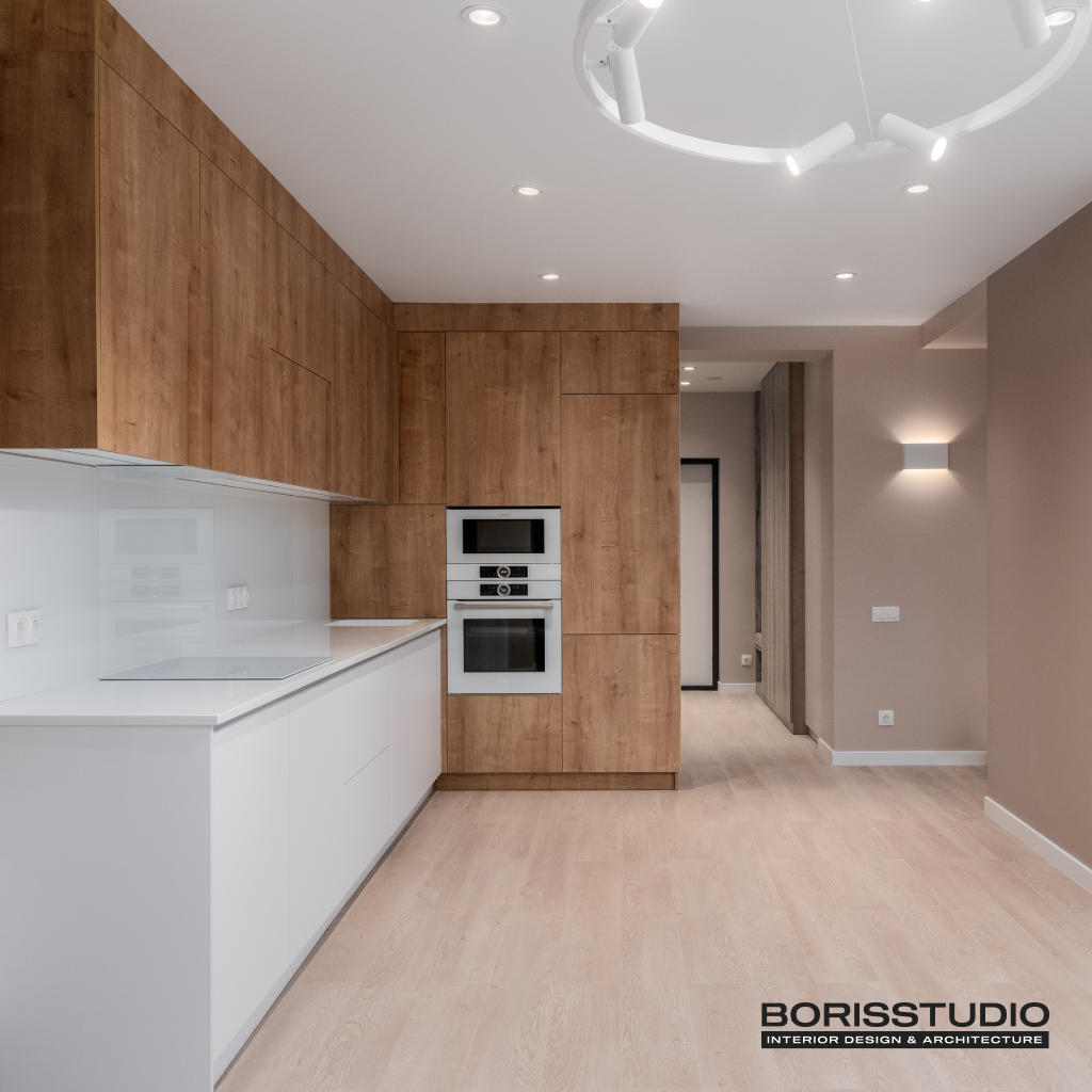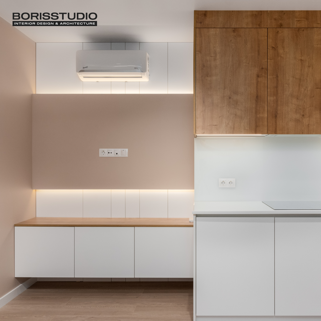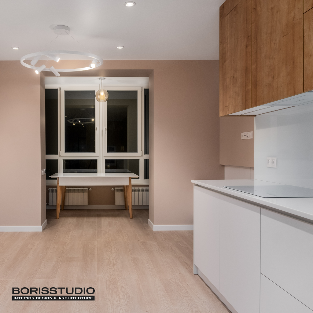 Дизайн інтер’єру кімнати виконаний у білих та пастельних тонах з дерев’яними акцентами. Кухня вийшла досить функціональною: