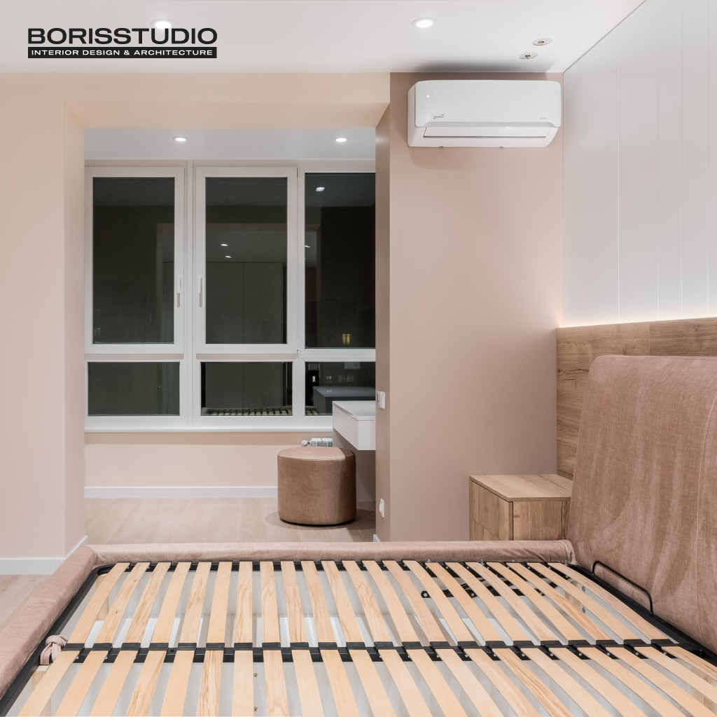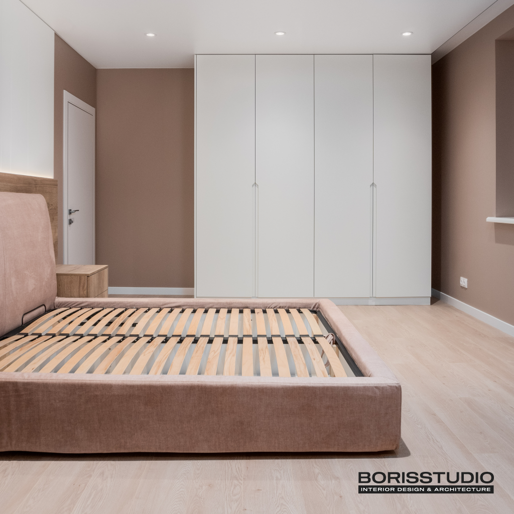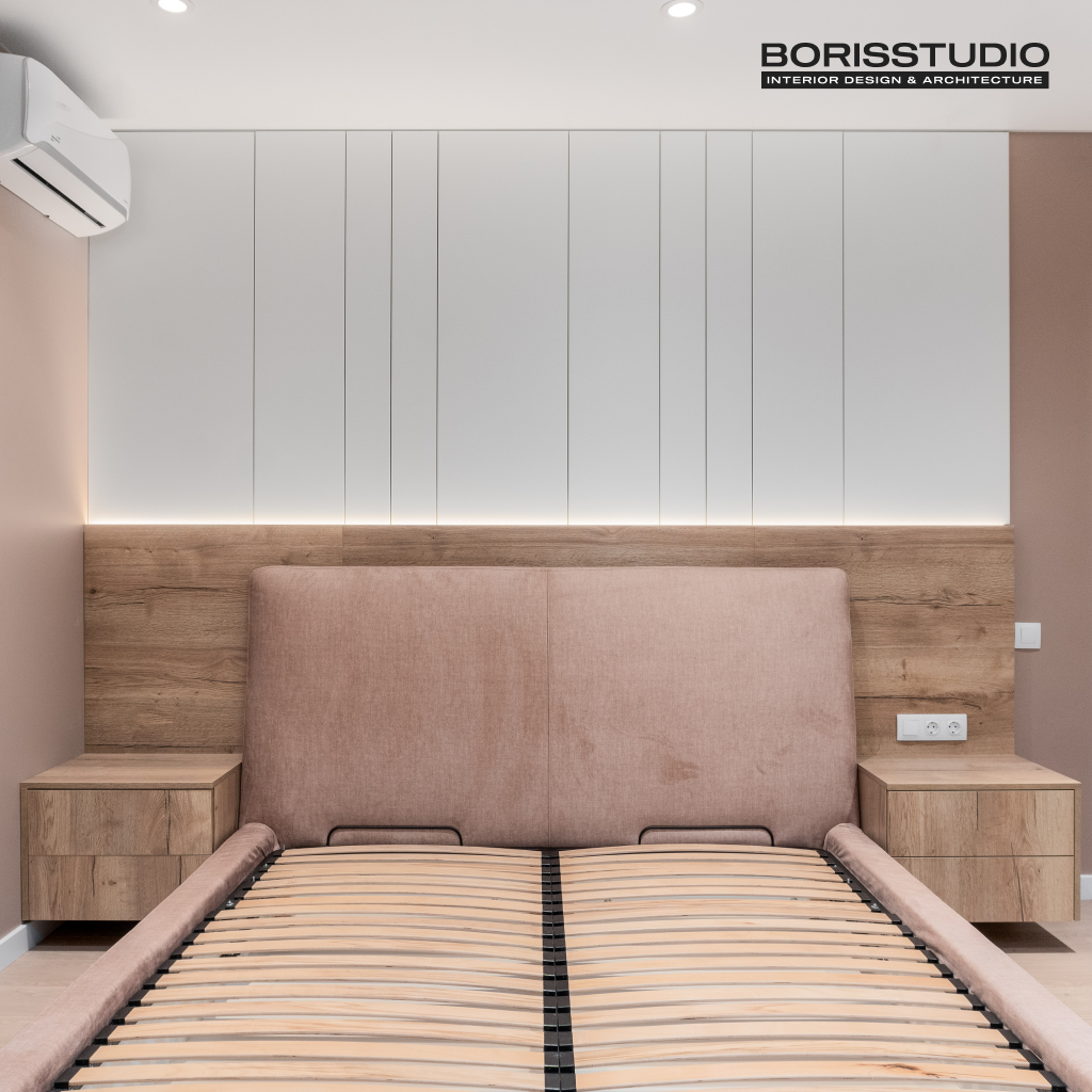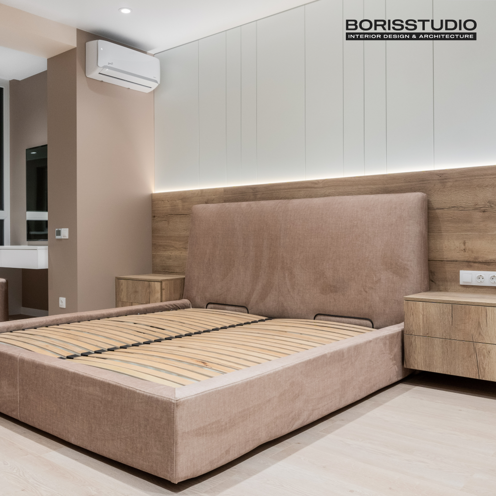 Дизайн спальні виконаний у білих та бежевих тонах з деревоподібними акцентами. У кімнаті є кілька сценаріїв освітлення: основне та вечірнє. Точкові світильники забезпечують хорошу освітленість у приміщенні, а підвісні світильники та підсвічування над узголів’ям ліжка допомагають створити розслаблюючу, романтичну атмосферу.