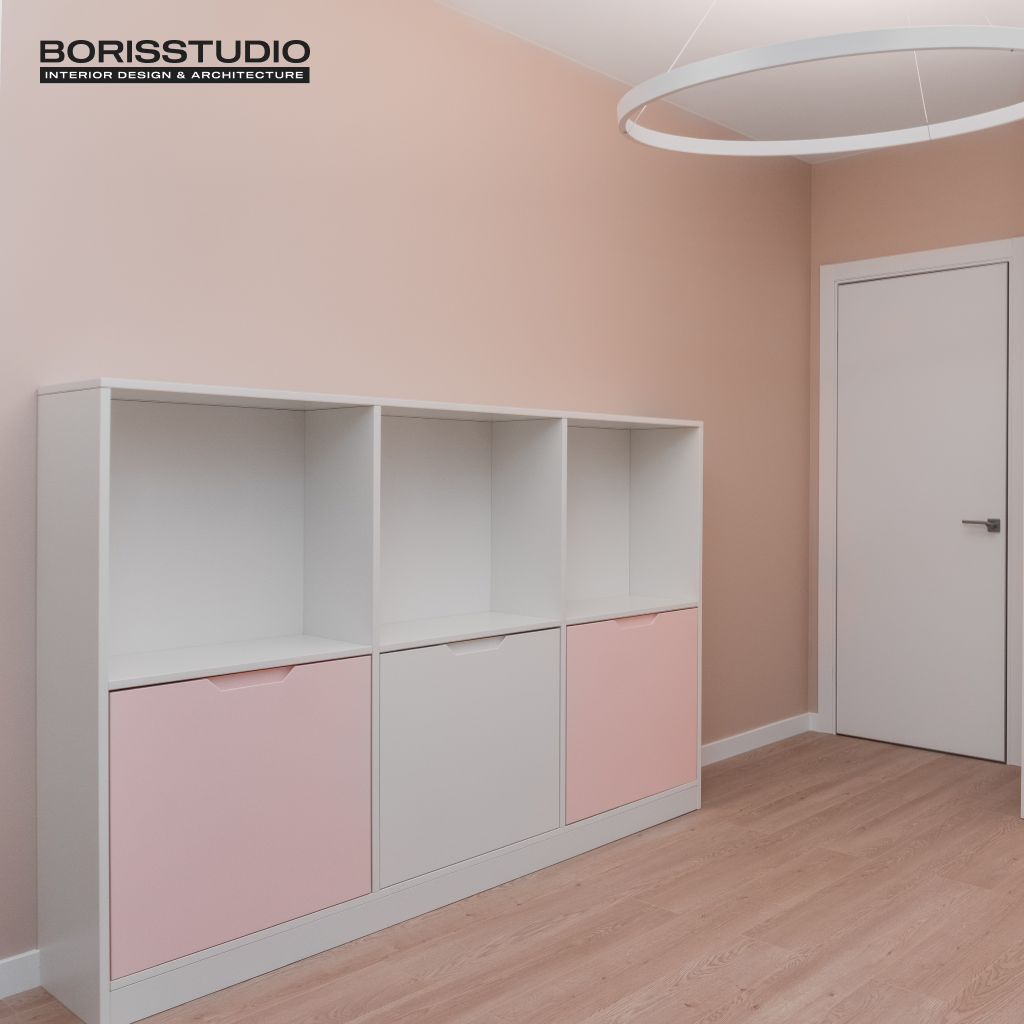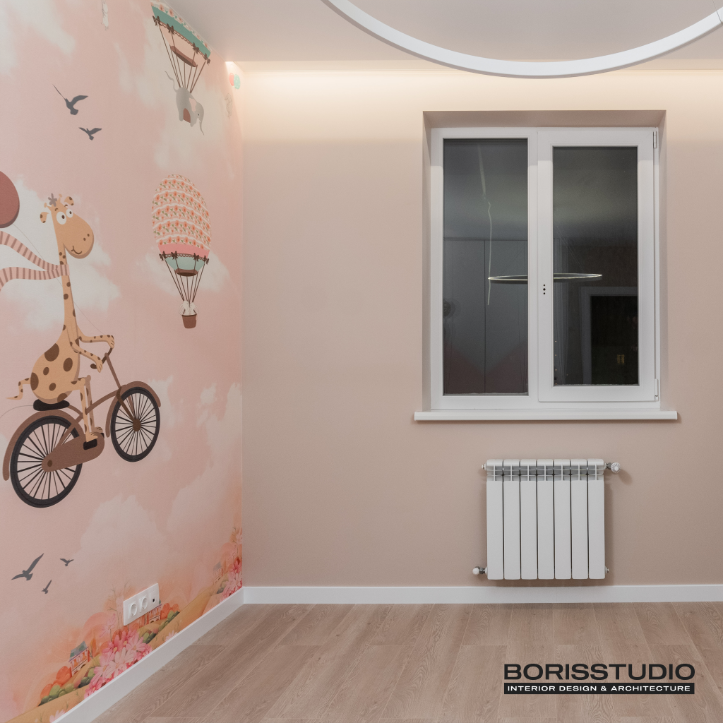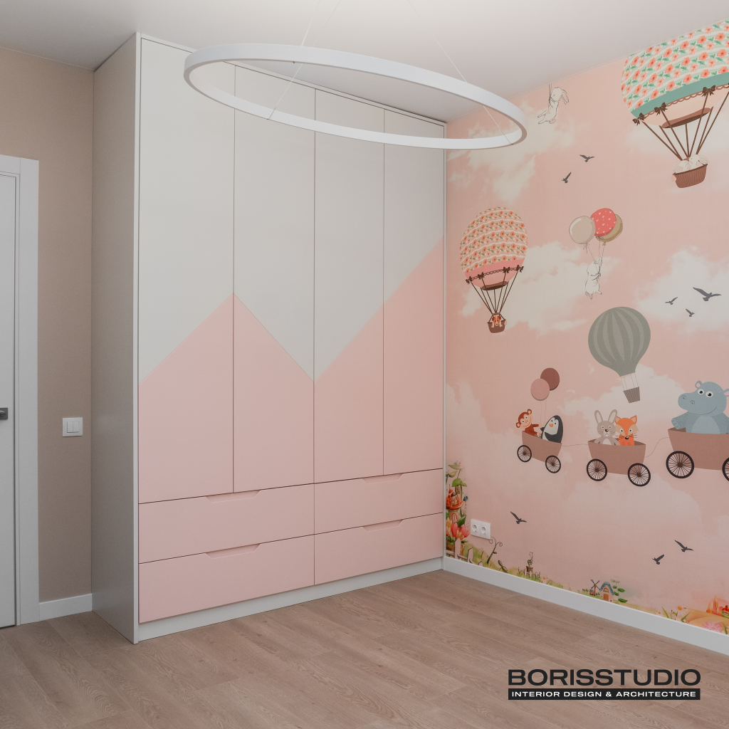 Дизайн кімнати розроблений у м’яких пастельних тонах. Візуально дитяча ділиться на 2 зони: