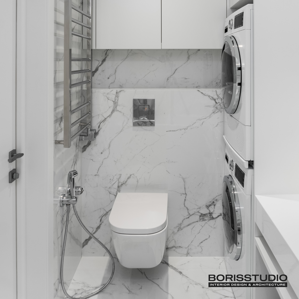 Дизайн ванної кімнати виконаний у білому кольорі з використанням мармурової плитки. Біля дизайнерського накладного умивальника та підвісної тумби розташована шафа для пральної та сушильної машин – відмінне рішення, щоб гарно сховати побутову техніку.