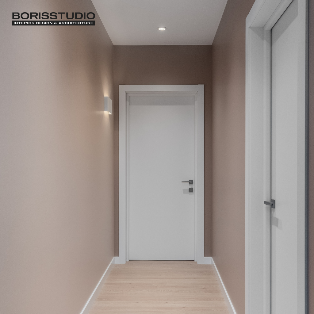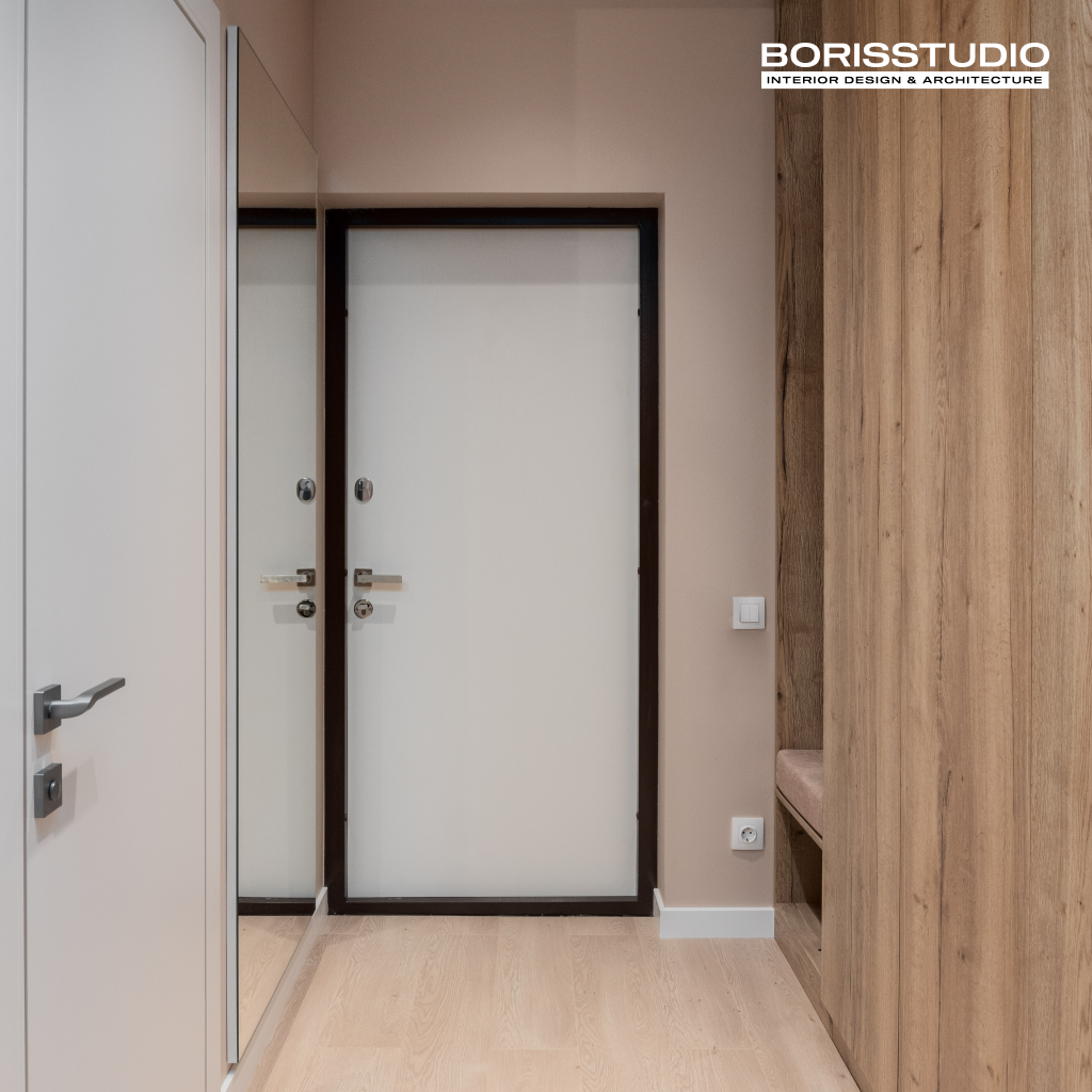 Вхідна зона виконана в білих та пастельних тонах з дерев’яними акцентами. У передпокої розмістили 2 шафи: для верхнього одягу та побутових дрібниць. Біля входу розташована банкетка з відкритою поличкою для зберігання взуття та підвісні гачки для шарфів, сумок.
