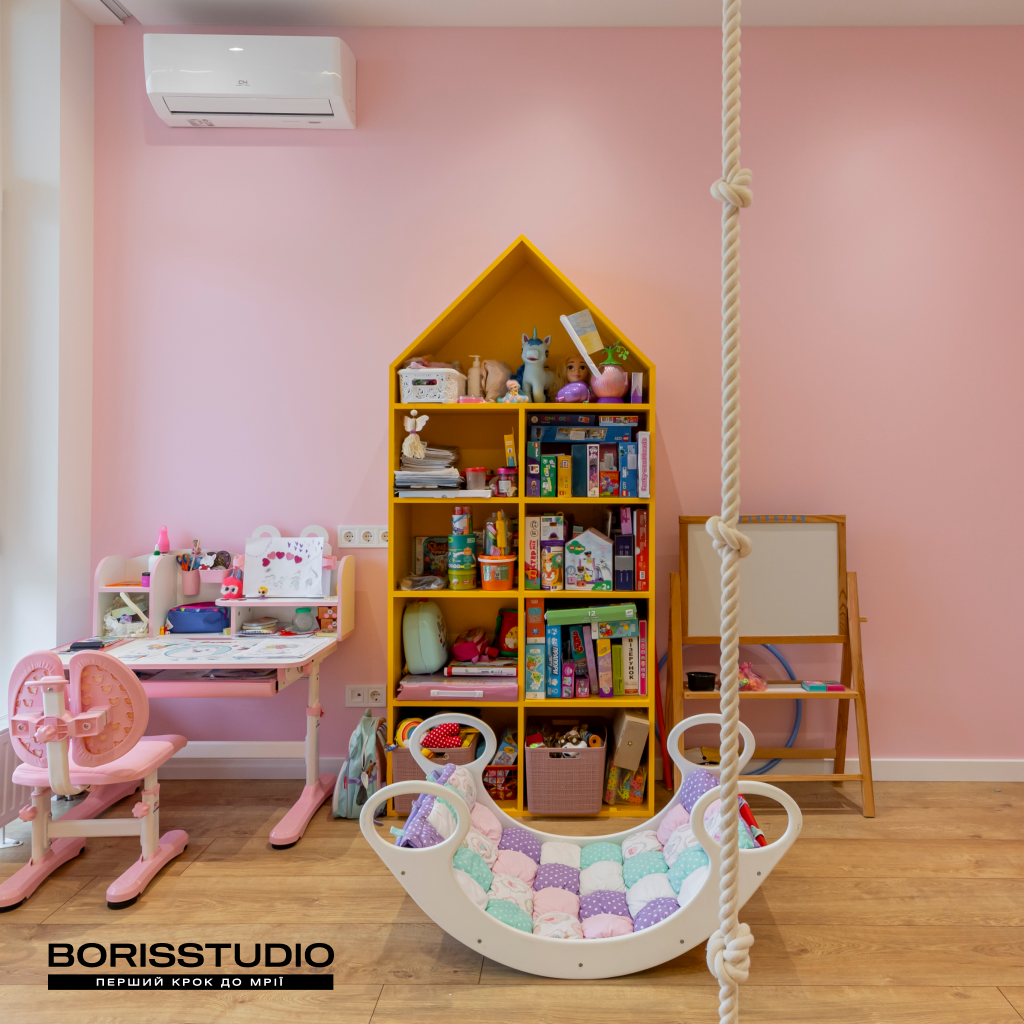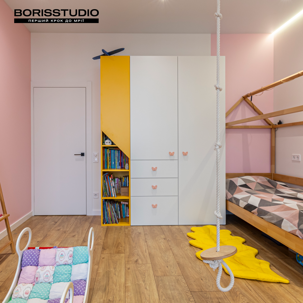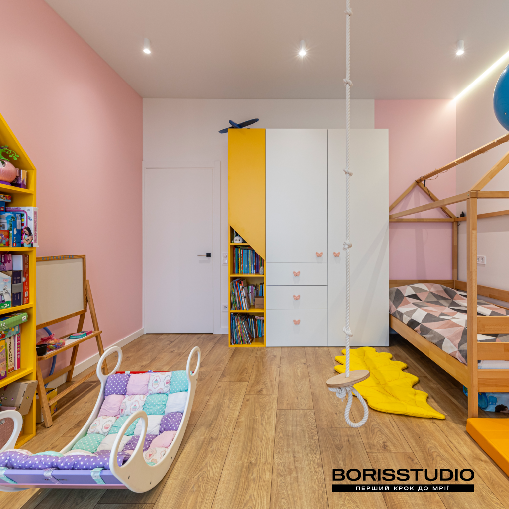 Інтер'єр дитячої кімнати площею 16,42 м2 вийшов дуже затишним. Для її оформлення ми вибрали життєрадісне поєднання рожевого та жовтого кольорів, яке заряджає позитивними емоціями. При цьому дитяча вийшла не лише естетичною, а й функціональною, в ній ми організували: