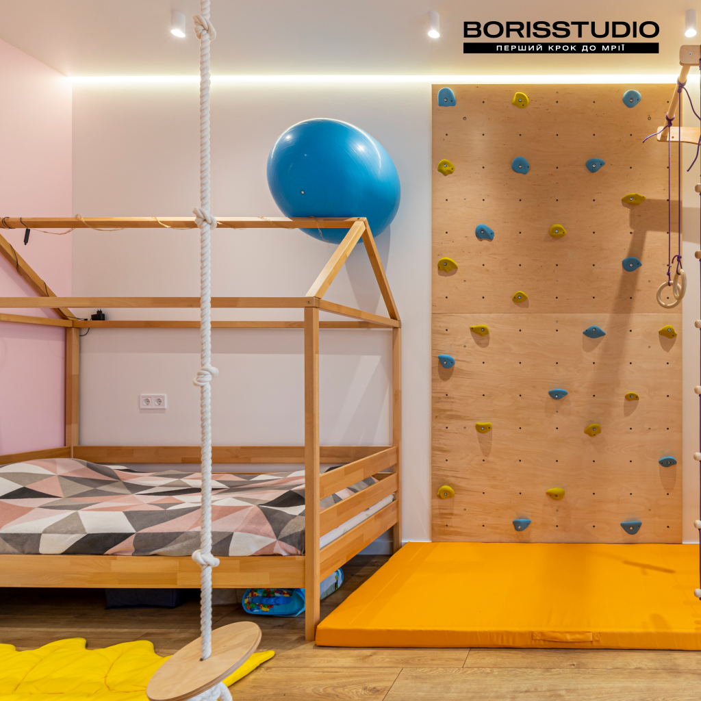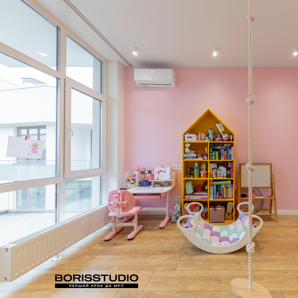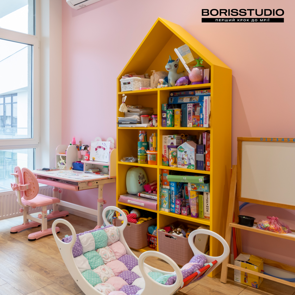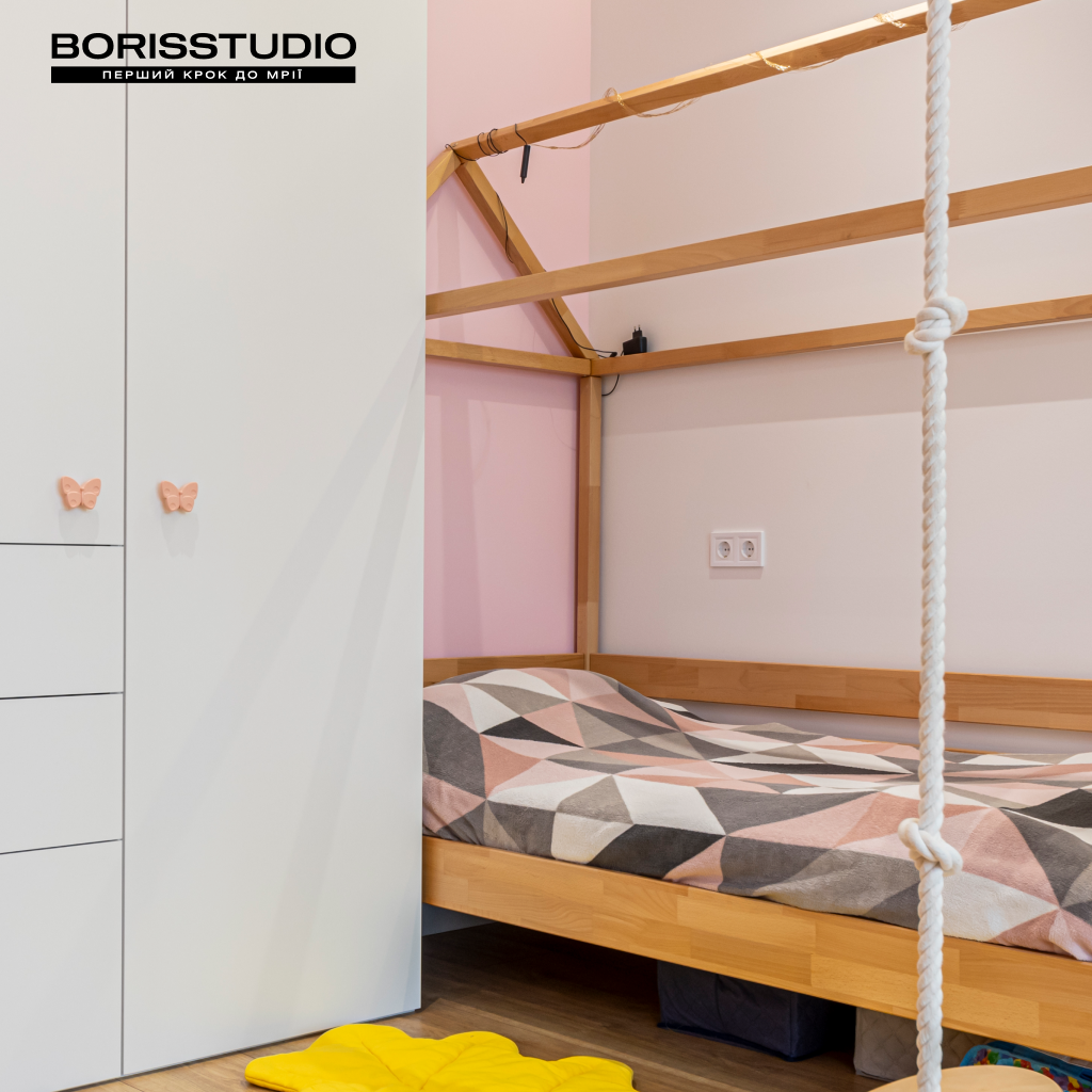 Інтер'єр дитячої кімнати площею 16,42 м2 вийшов дуже затишним. Для її оформлення ми вибрали життєрадісне поєднання рожевого та жовтого кольорів, яке заряджає позитивними емоціями. При цьому дитяча вийшла не лише естетичною, а й функціональною, в ній ми організували:
