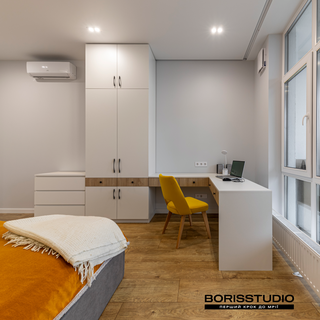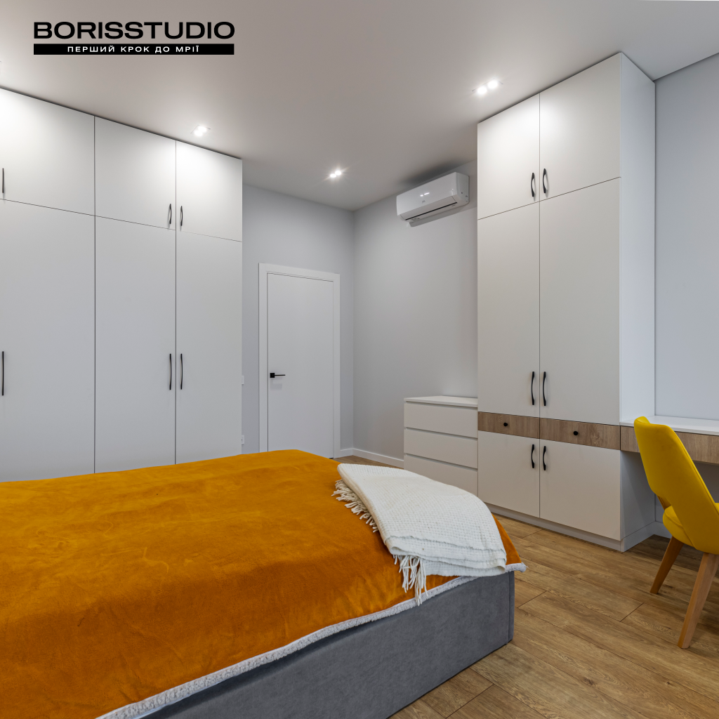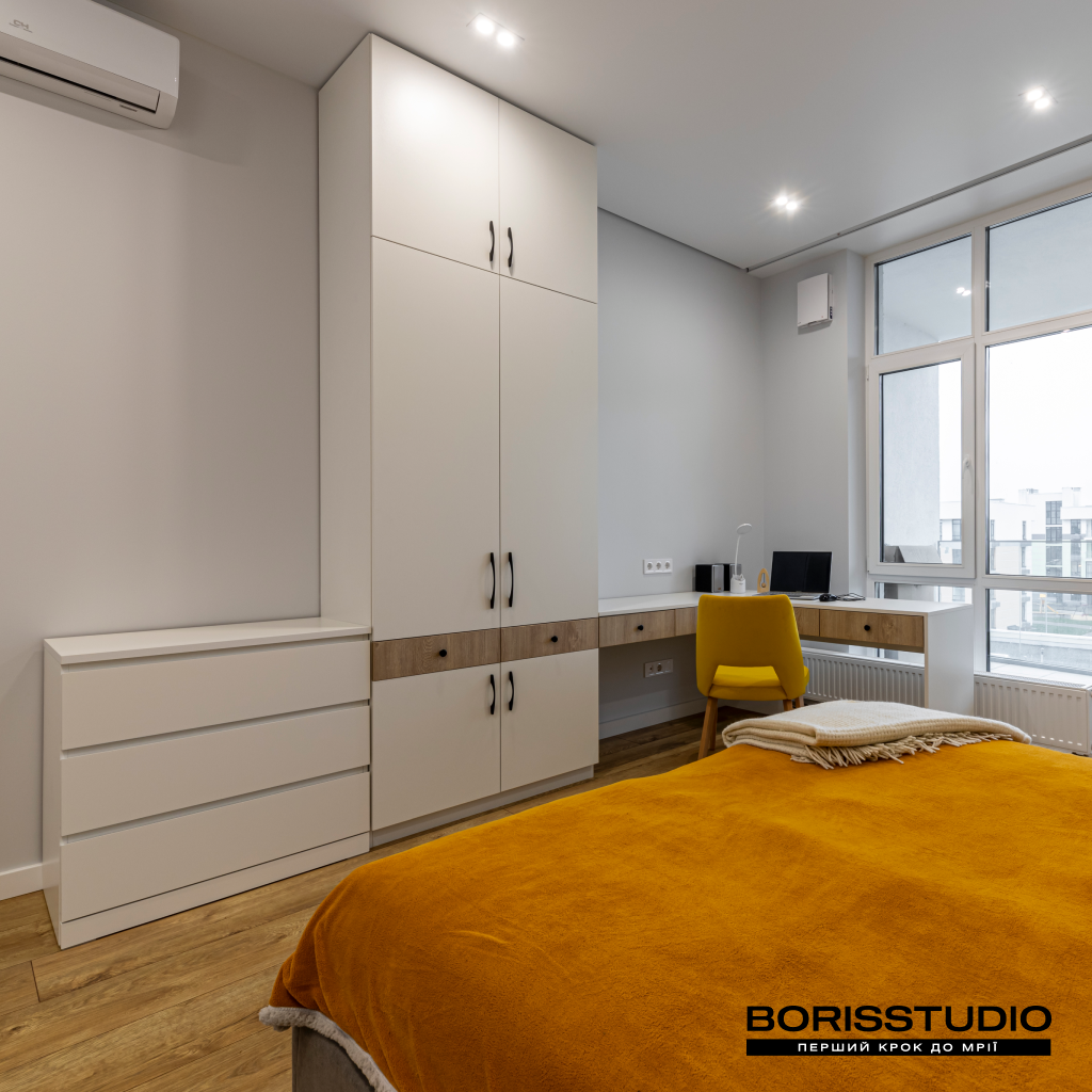 Частина спальні відведена під робочу зону, яка крім столу та крісла доповнена книжковою шафою та парою полиць. За зберігання речей відповідає шафа з антресолями до стелі, а також комод з лаконічними фасадами.