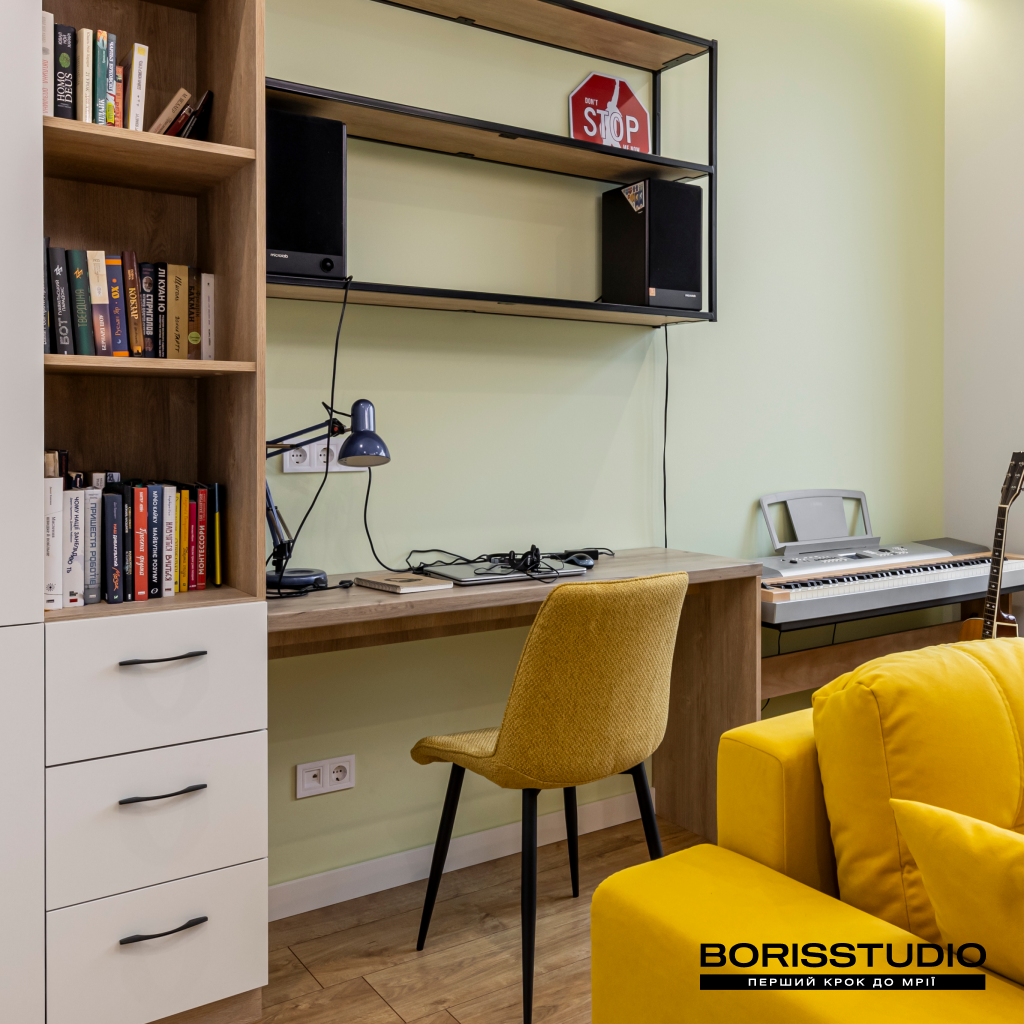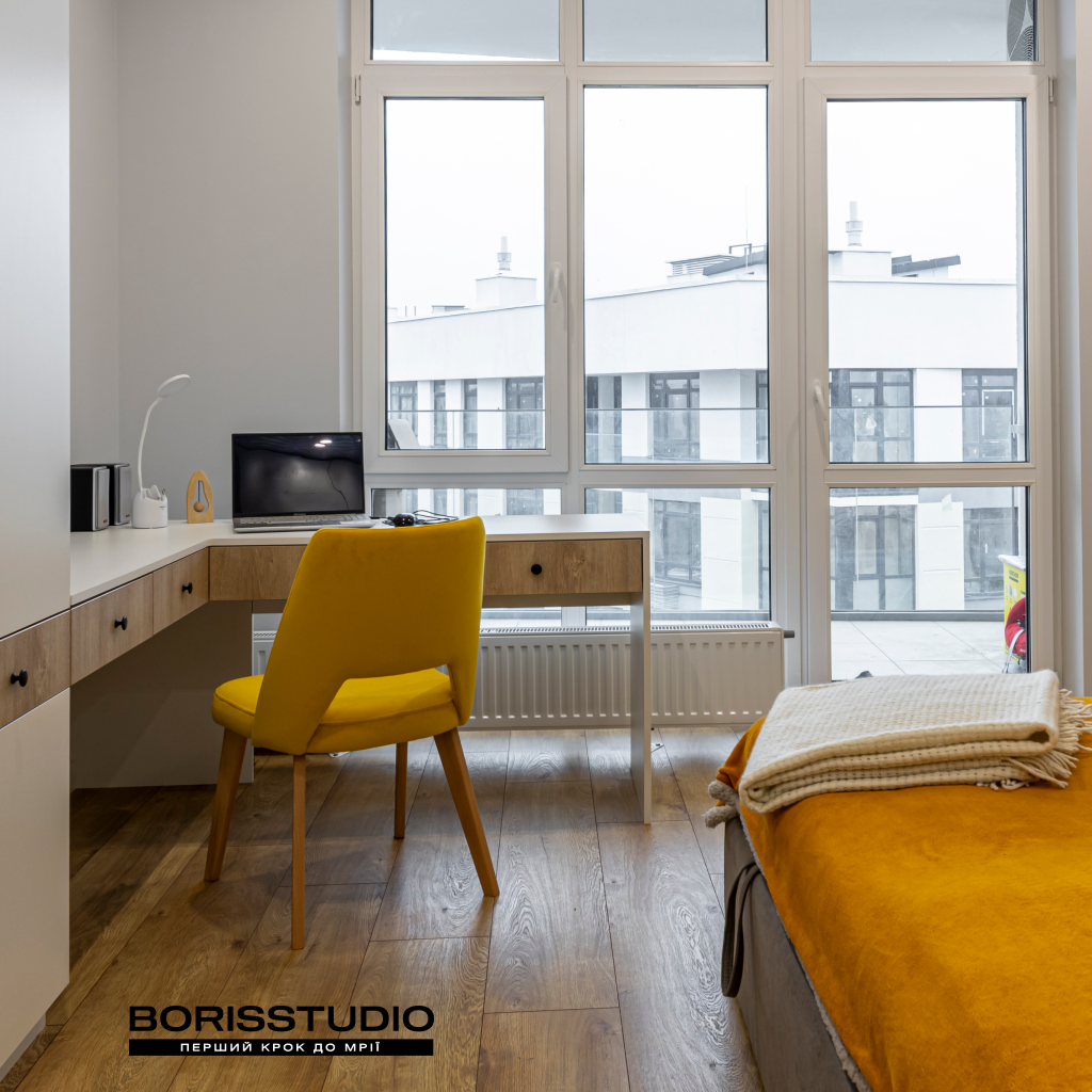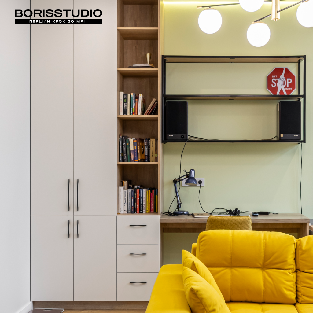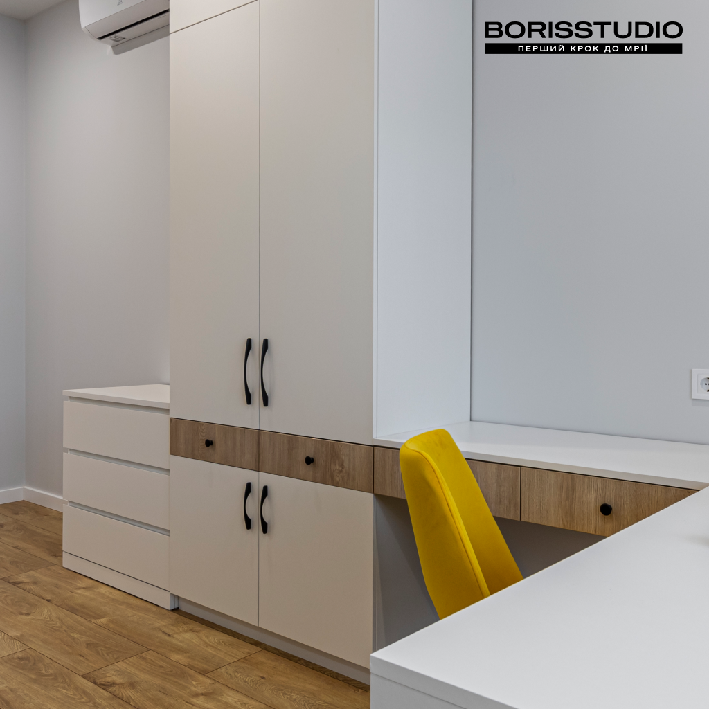 Частина спальні відведена під робочу зону, яка крім столу та крісла доповнена книжковою шафою та парою полиць. За зберігання речей відповідає шафа з антресолями до стелі, а також комод з лаконічними фасадами.