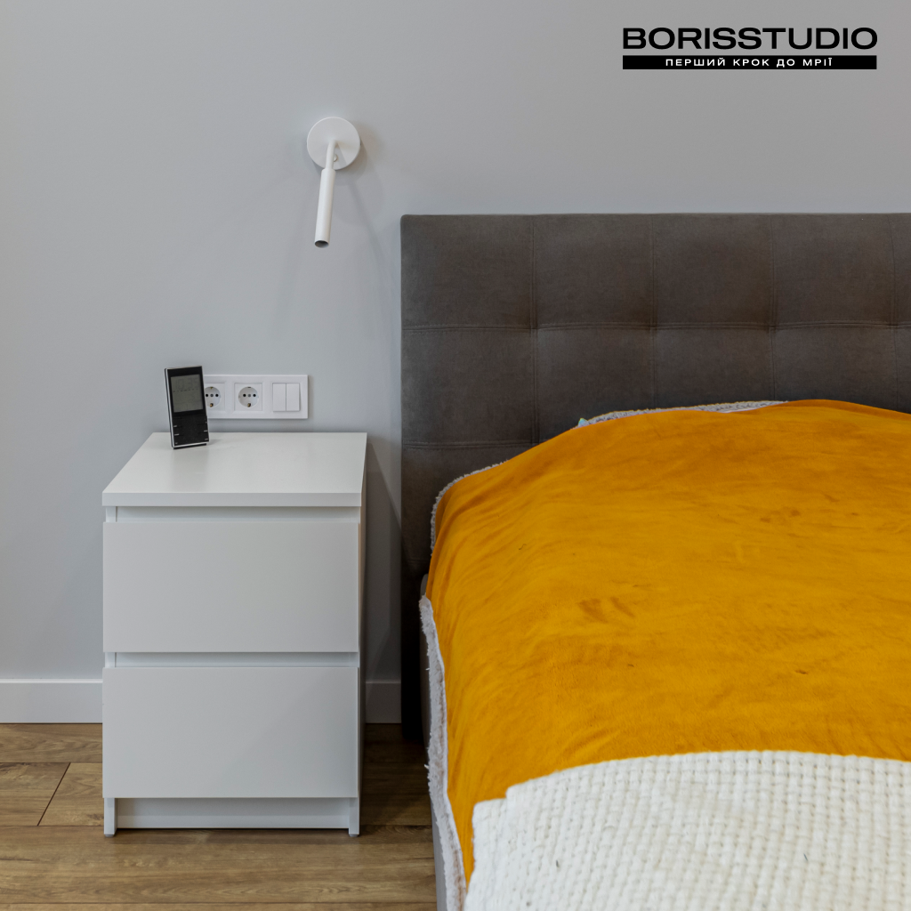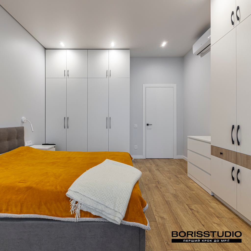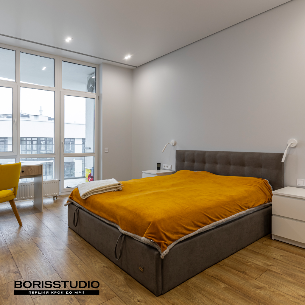 Інтер'єр спальні, площа якої становить 19,35 м2, вийшов більш стриманим. Розмаїття фарб у такій кімнаті заважало б комфортному сну, тому ми зробили ставку на лаконічність мінімалізму. Монохромний інтер'єр розбавили за допомогою кількох яскравих акцентів – картини в узголів’ї ліжка, текстилю, крісла.