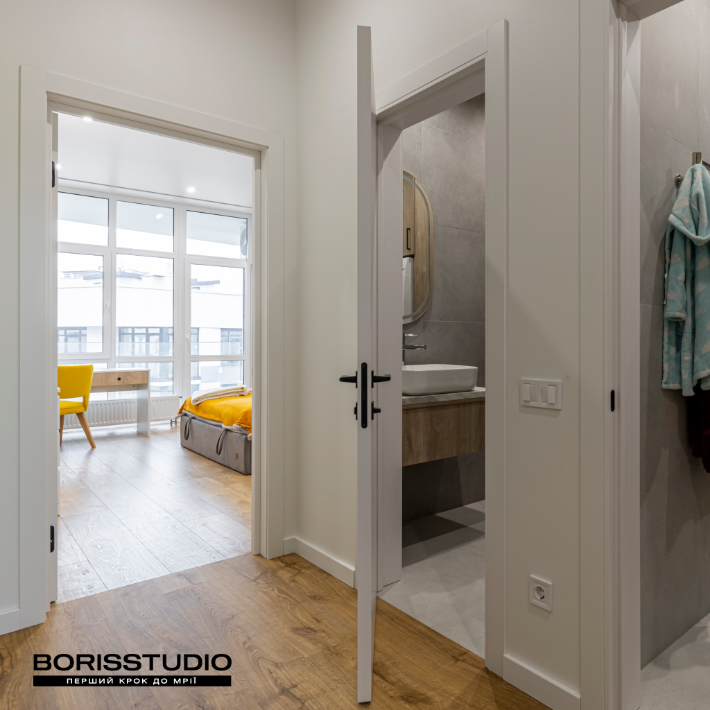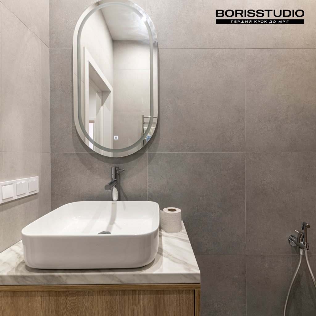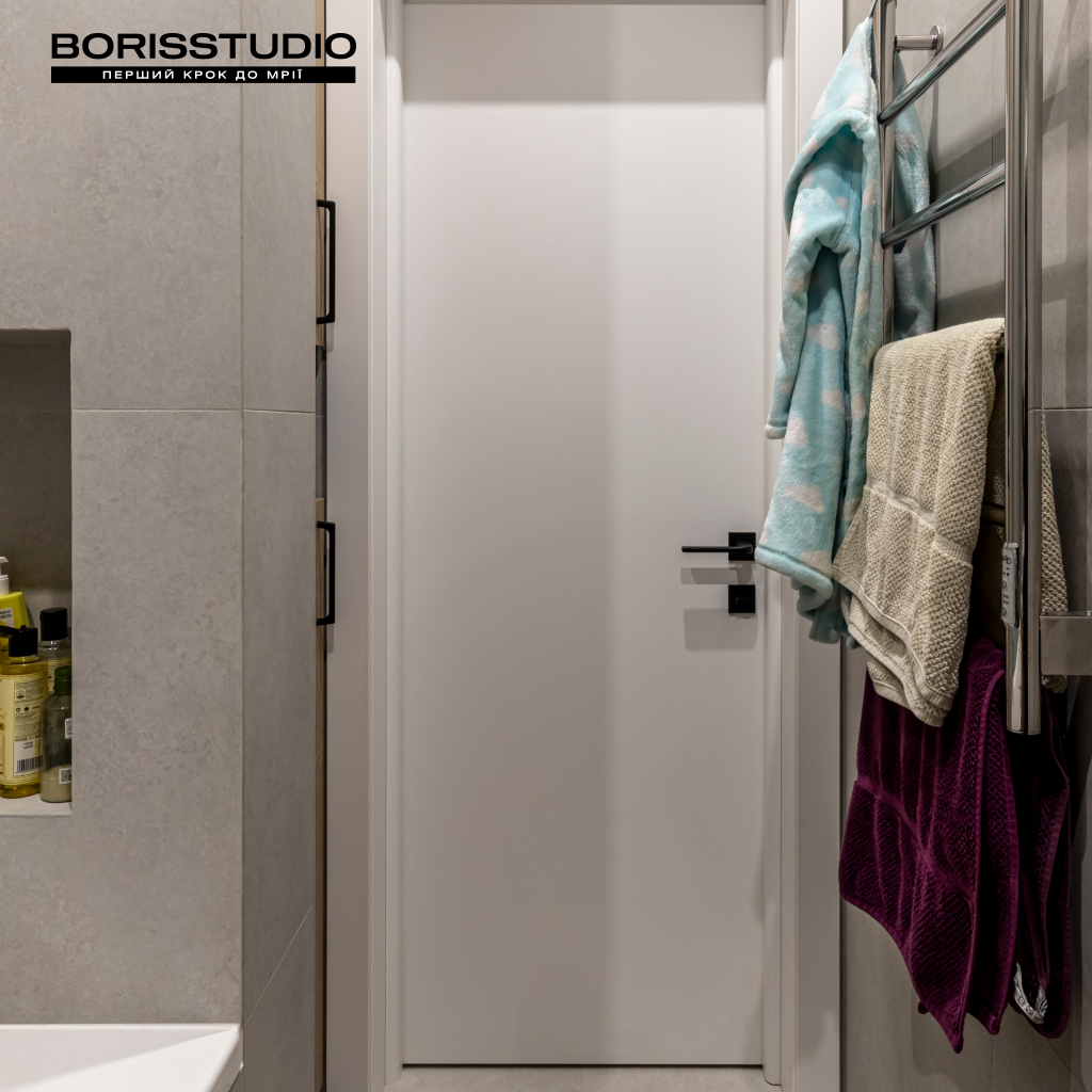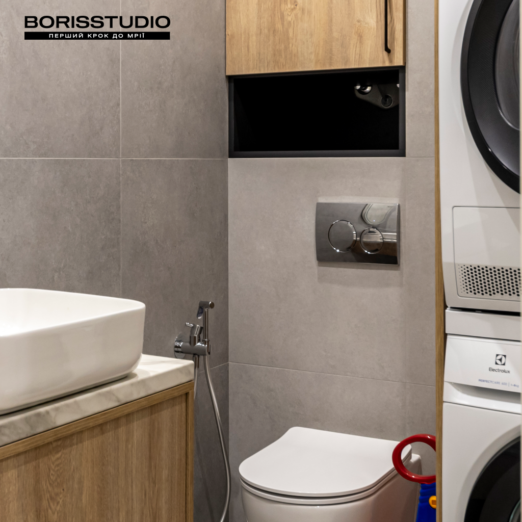 Ванна кімната площею 3,46 м2 та санвузол (2,95 м2) виконані в єдиній стилістиці. Їхній інтер'єр лаконічний та функціональний, позбавлений зайвих деталей. Через невелику площу приміщень задіяли лише мінімально необхідні елементи наповнення. У ванній кімнаті це ванна зі скляною шторкою, підвісна тумба з раковиною, вузька шафа з закритими гладкими фасадами, дзеркало з підсвічуванням і сушка для рушників. У санвузлі розмістили підвісний унітаз з інсталяцією, шафу з місцем для пральної та сушильної машин, компактну тумбу з раковиною та дзеркалом. За ЛДСП панелями сховається бойлер.