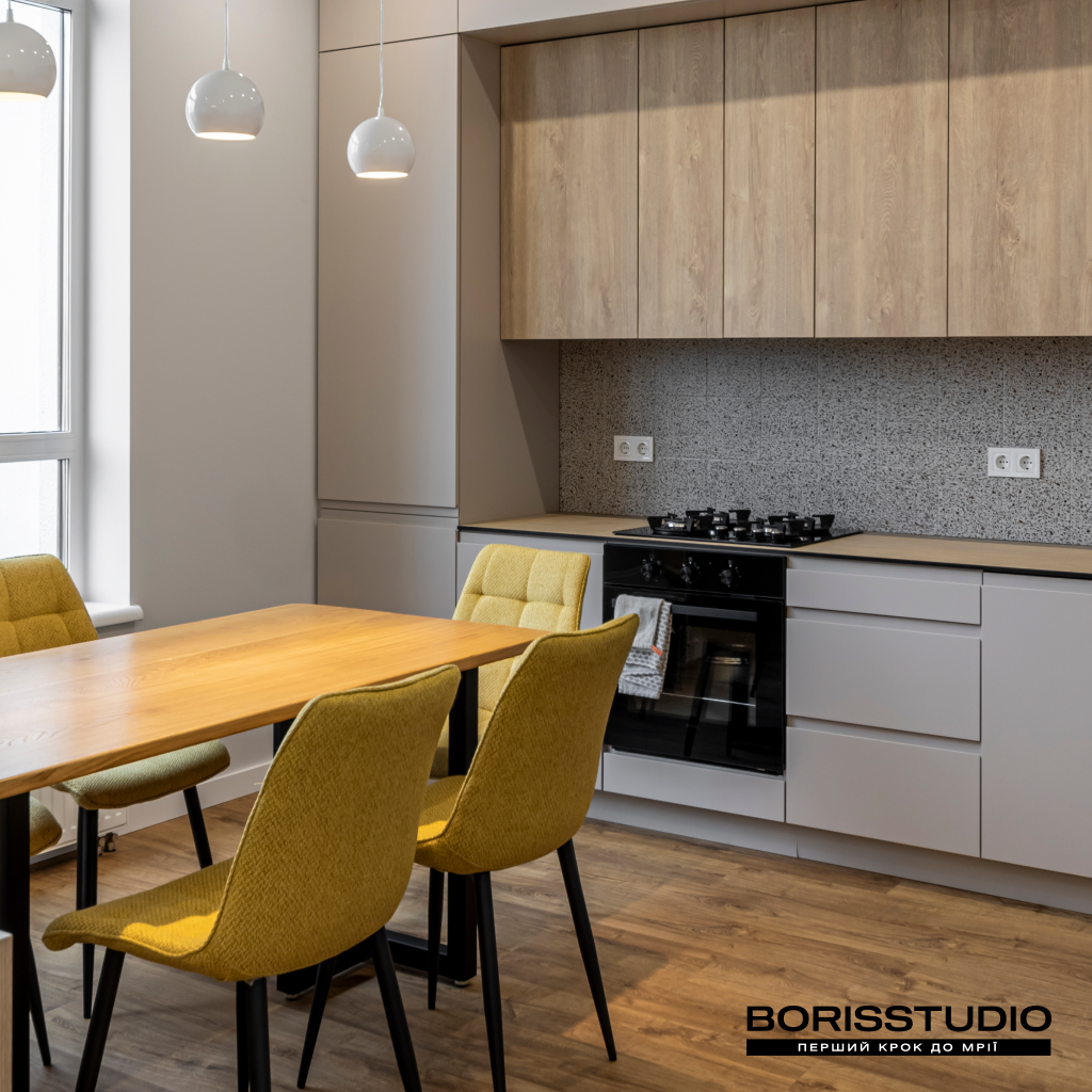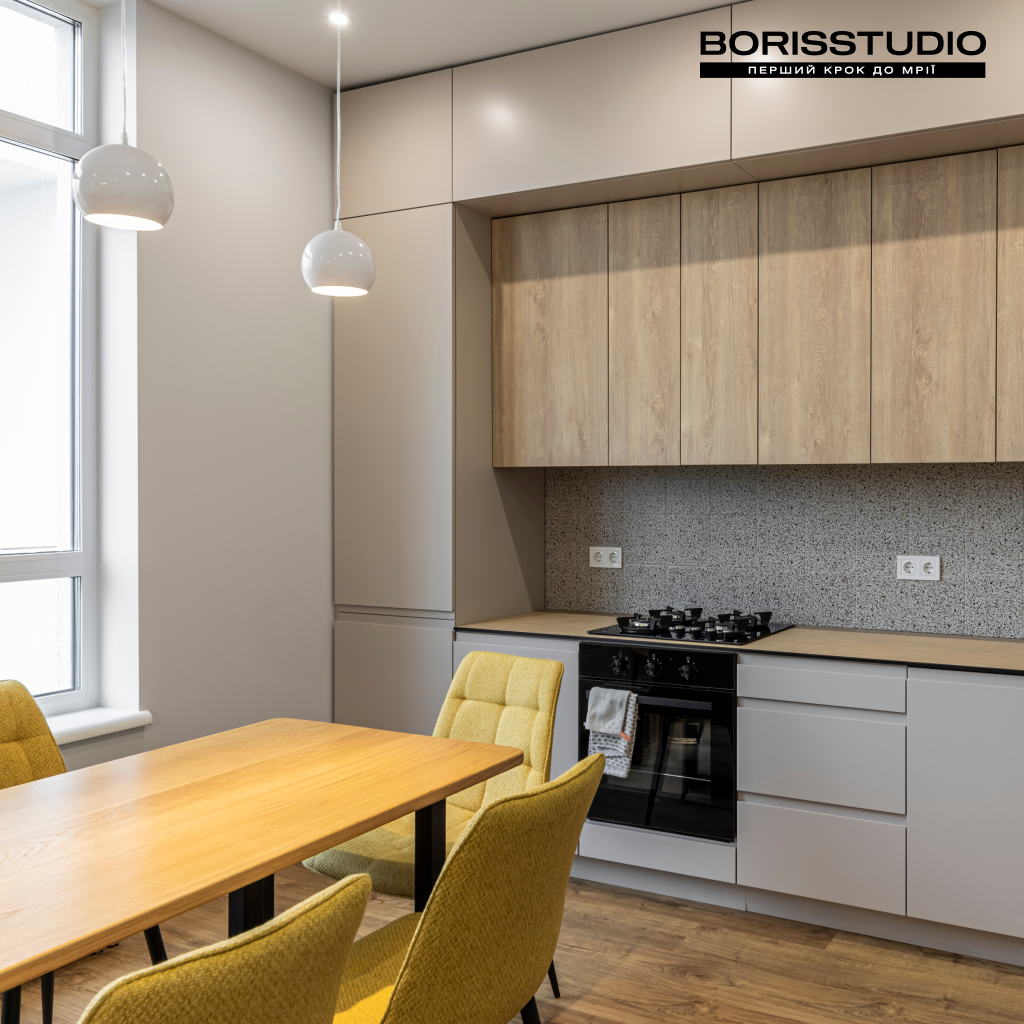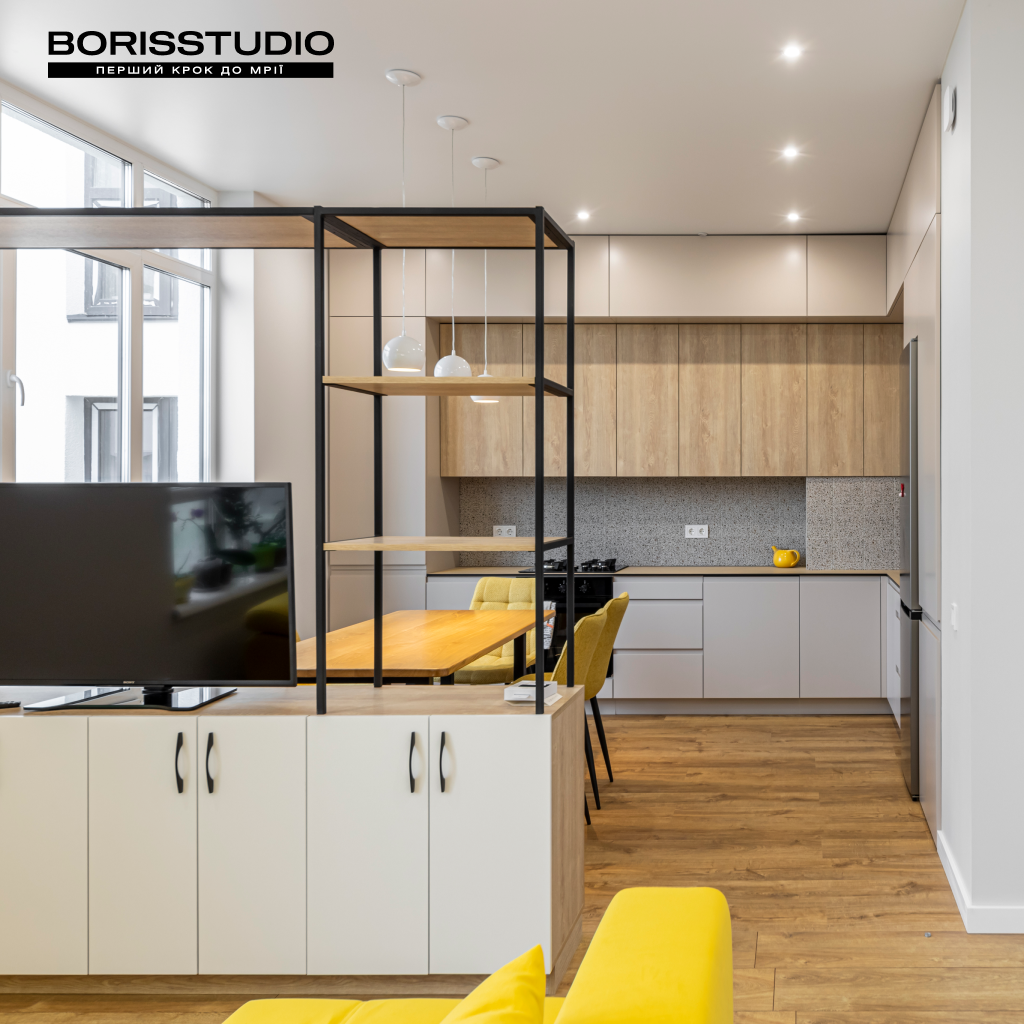 У кухні-вітальні, площа якої після перепланування склала 32,38 м2, ми організували кілька різних функціональних зон: для приготування їжі та обідню, для відпочинку, роботи та творчості. Для зонування простору використали кілька прийомів: