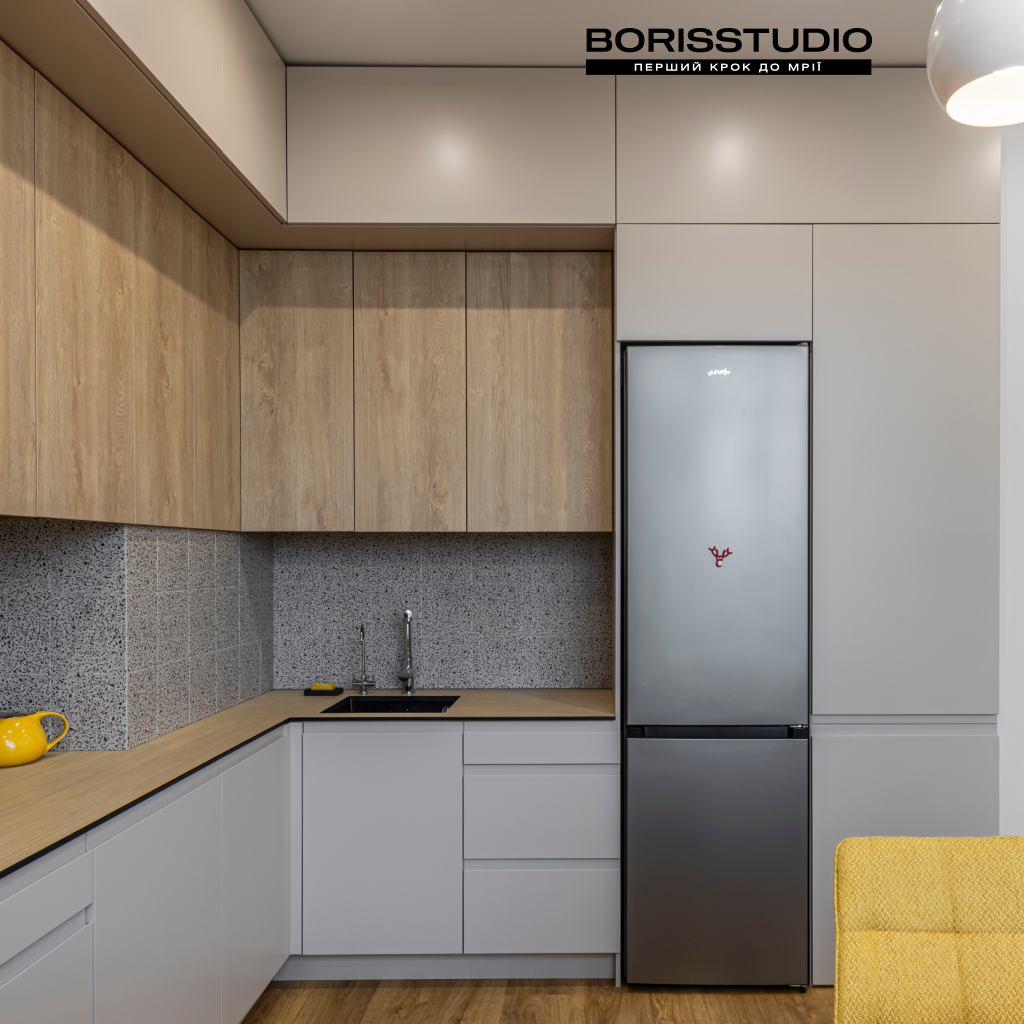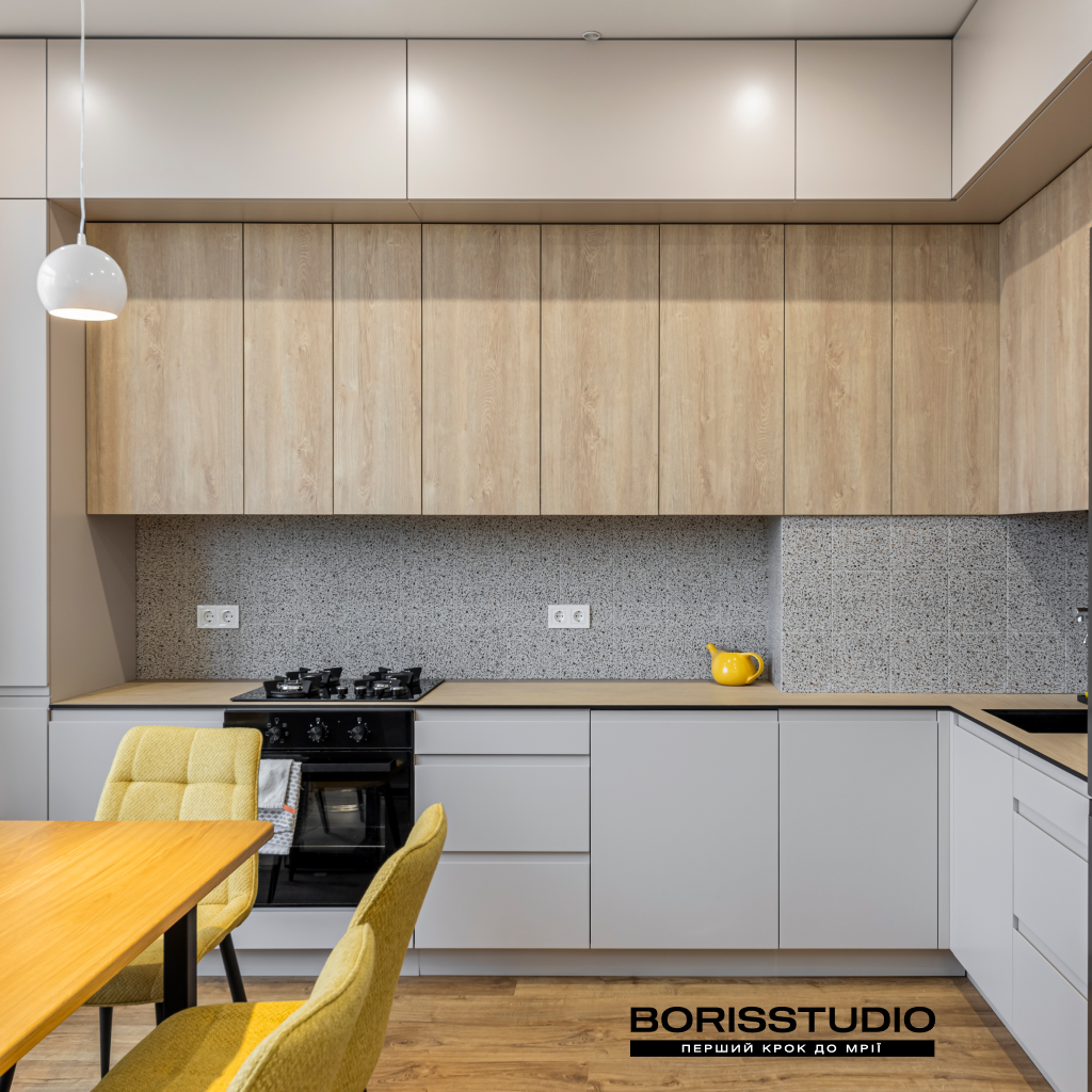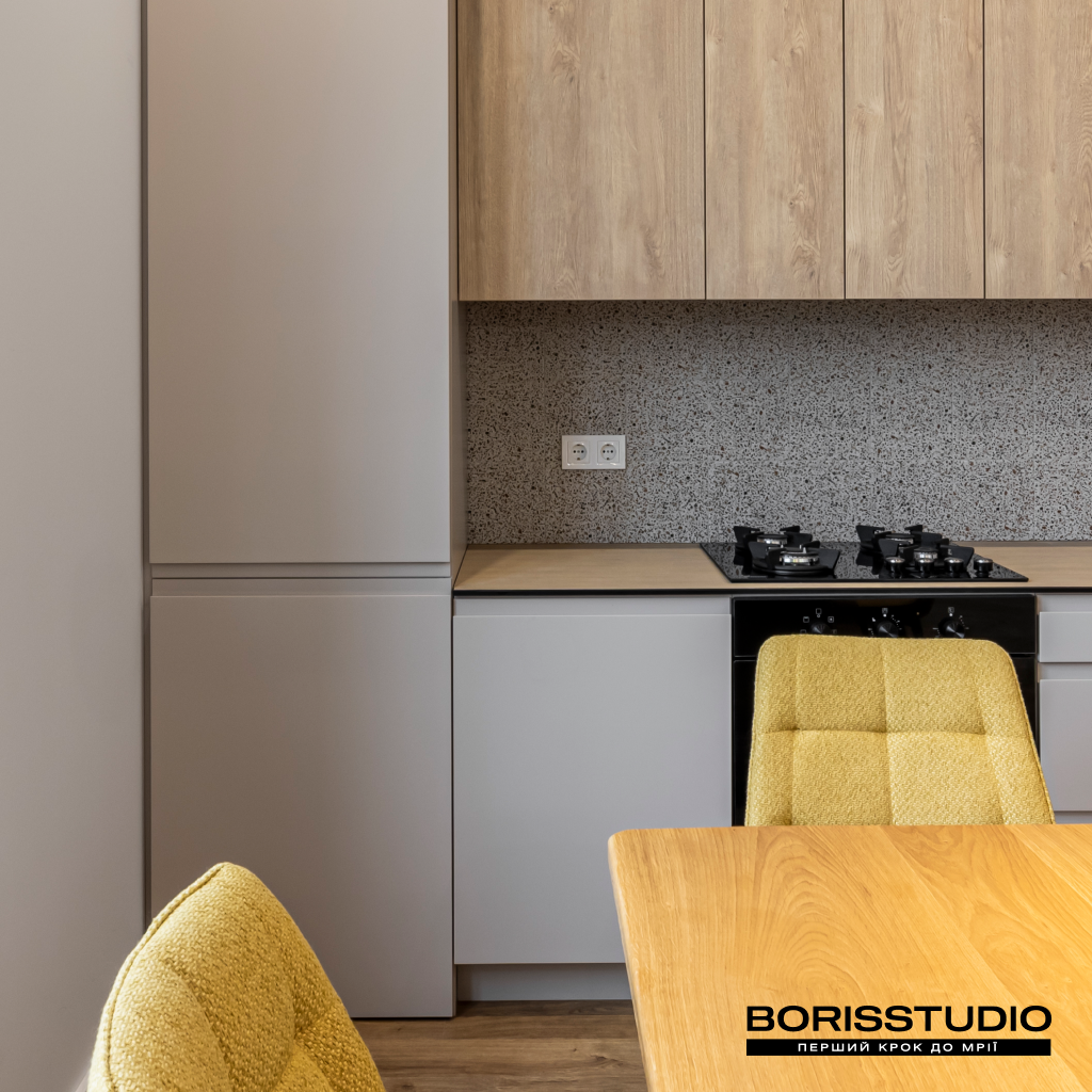 У кухні-вітальні, площа якої після перепланування склала 32,38 м2, ми організували кілька різних функціональних зон: для приготування їжі та обідню, для відпочинку, роботи та творчості. Для зонування простору використали кілька прийомів: