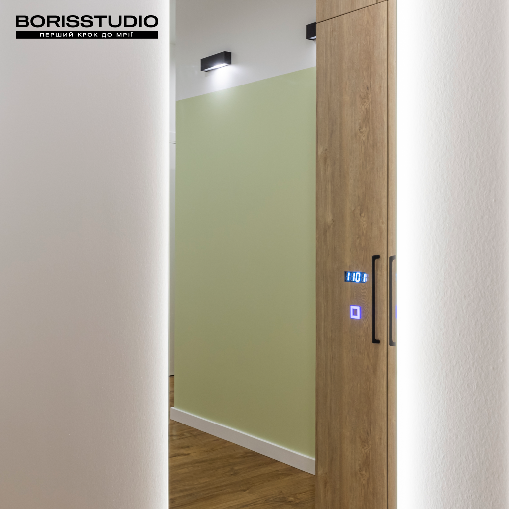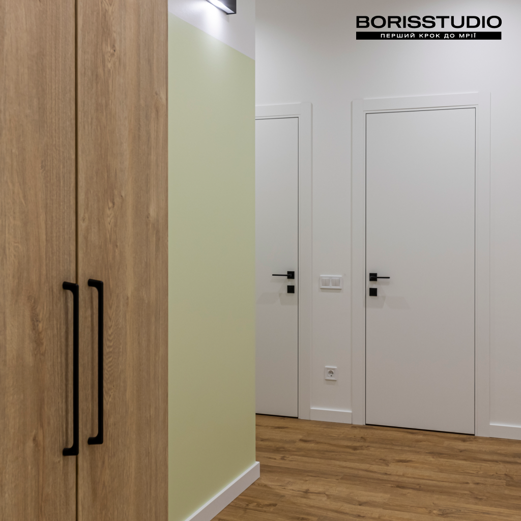 У квартирі досить високі стелі, близько 3 м. Щоб з максимальною користю залучити простір, було запропоновано використовувати системи зберігання індивідуального виготовлення, зокрема шафи з антресолями висотою до стелі. Завдяки лаконічному дизайну та переважно світлим відтінкам системи зберігання не здаються занадто масивними та візуально не перевантажують простір.