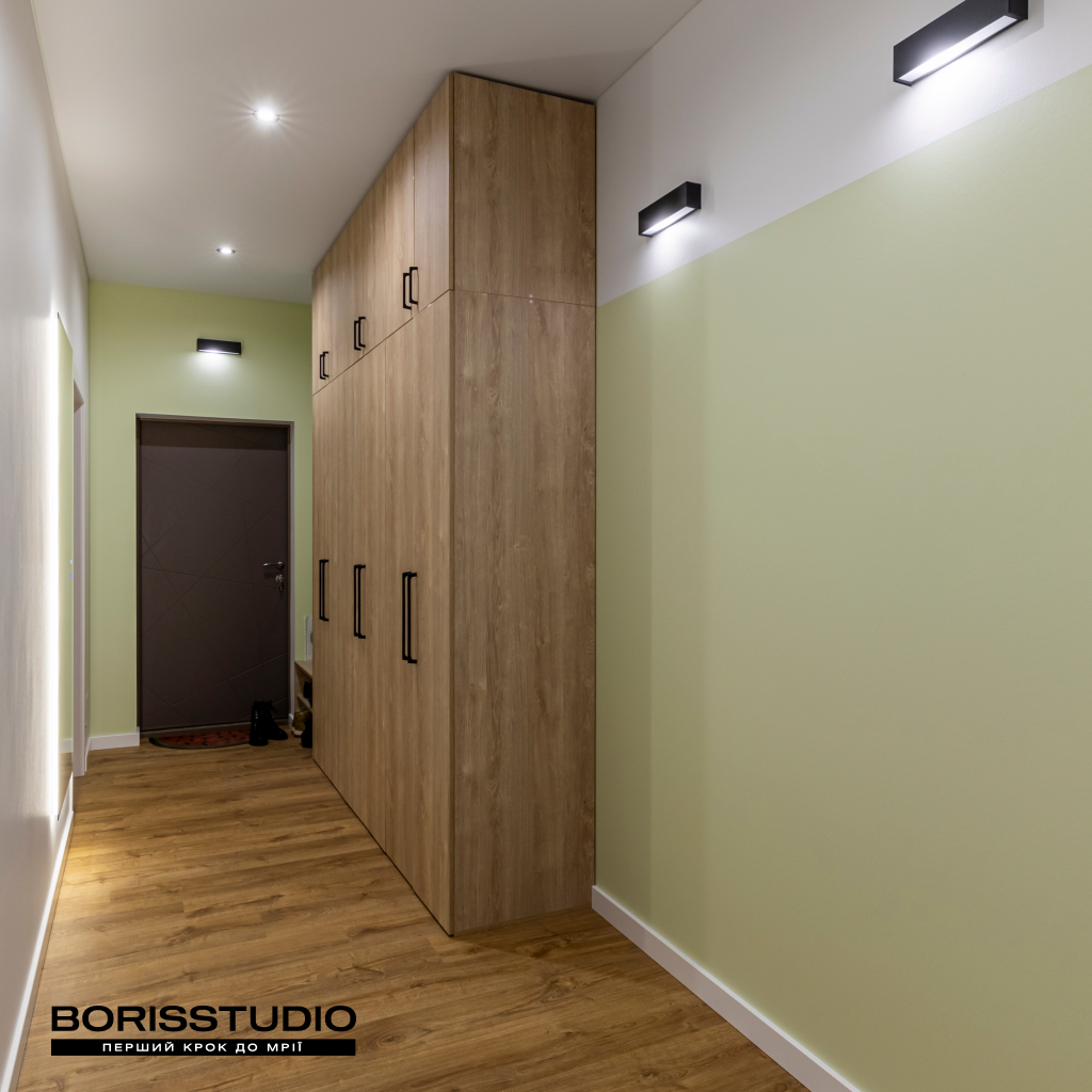В оформленні передпокою переважають світлі відтінки, які разом із продуманим освітленням допомагають компенсувати нестачу природного світла та візуально зробити простір більшим. Крім місткої шафи висотою до стелі на площі 12,93 м2 передбачили місце для зберігання велосипеда. Ліворуч від входу до квартири було запропоновано розмістити гачки для верхнього одягу, візуально виділити стіну за допомогою рельєфних панелей. Щоб зробити процес зборів більш комфортним, додали банкетку з відсіком для взуття.