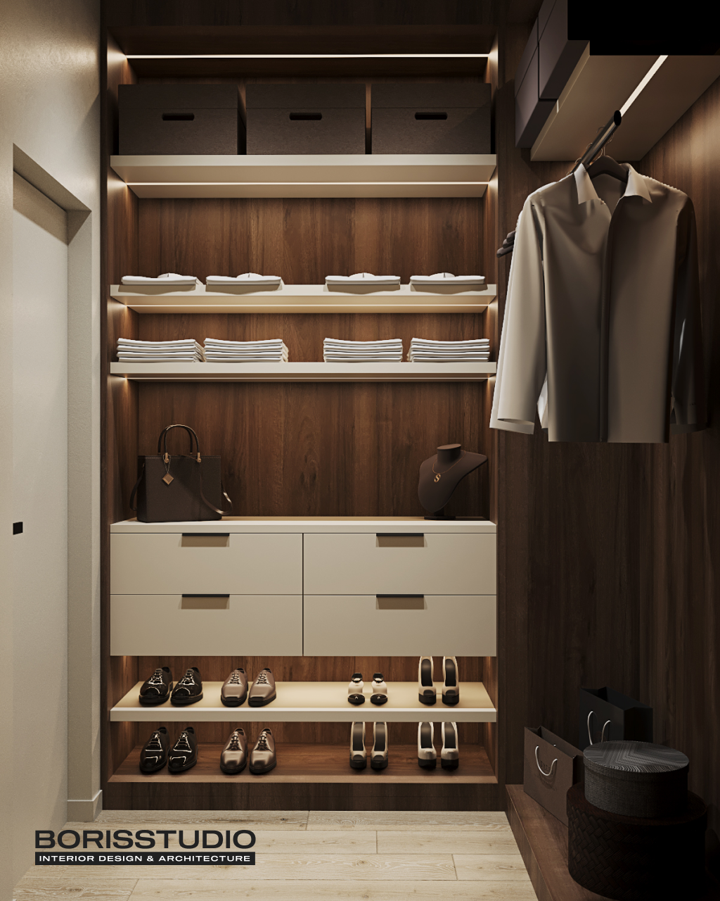 На вибір основних елементів наповнення гардеробної кімнати на замовлення впливають вподобання замовника, площа, а також кількість та особливості речей, які будуть в ній зберігатися. За розміщення речей можуть відповідати: